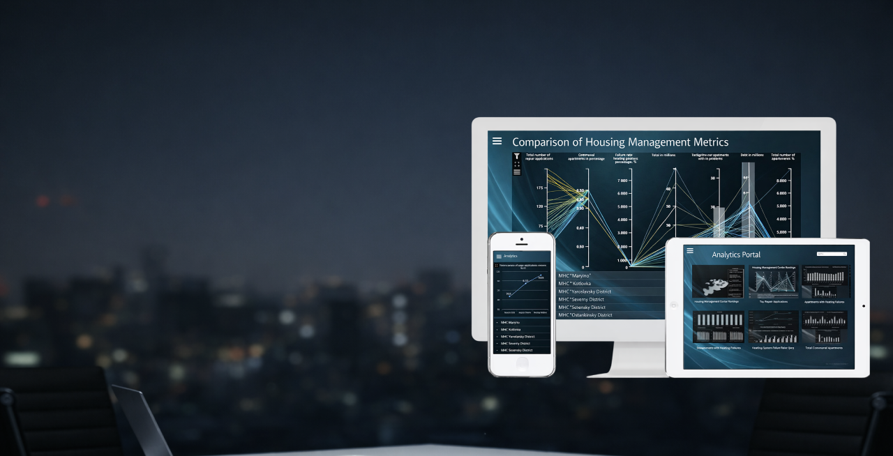 The project included a rich presentation layer with standard charts, custom visuals, interactive elements, and even 3D representations of analytical data. It also supported geo-analytics such as KPI distribution across city districts on a 3D map.